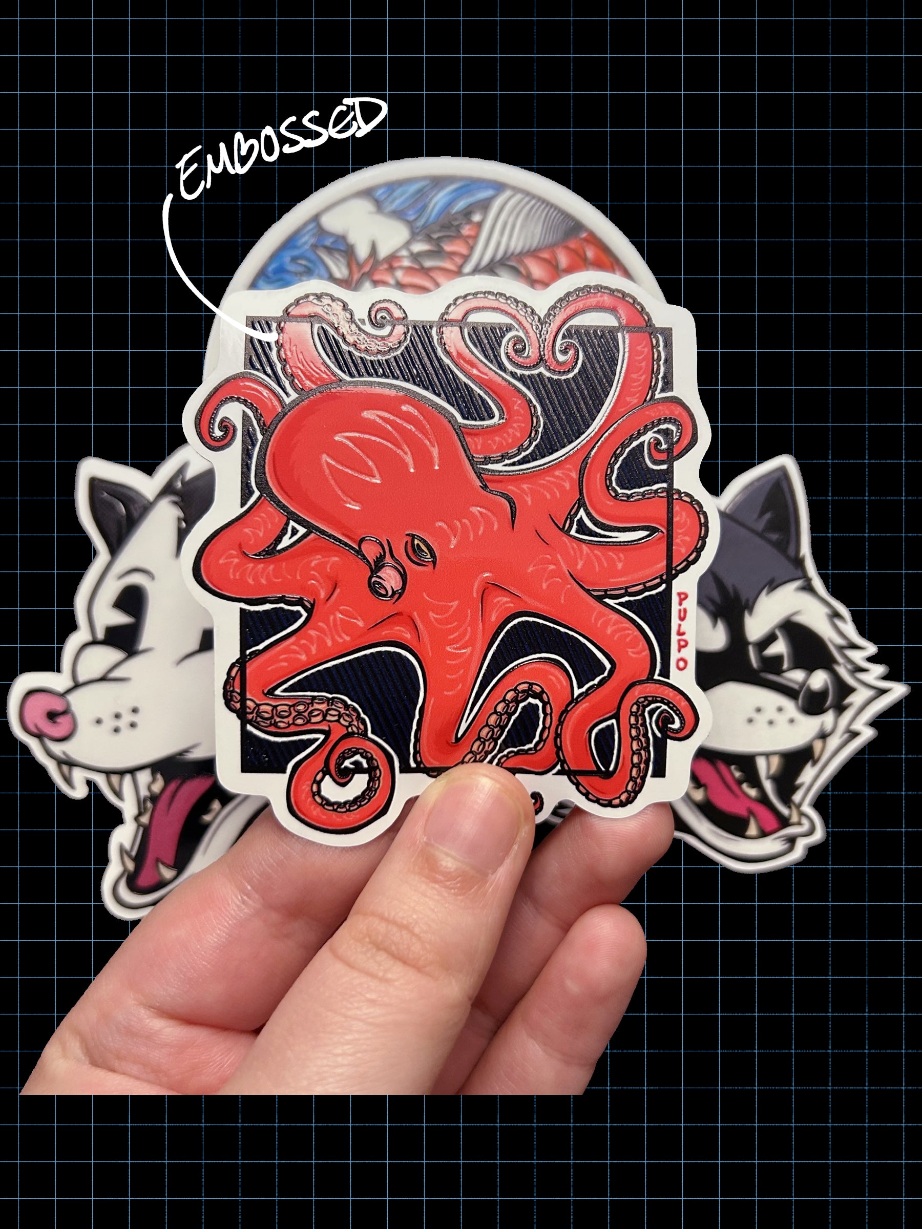 Stickers are 3in x 3in and embossed except for the skull